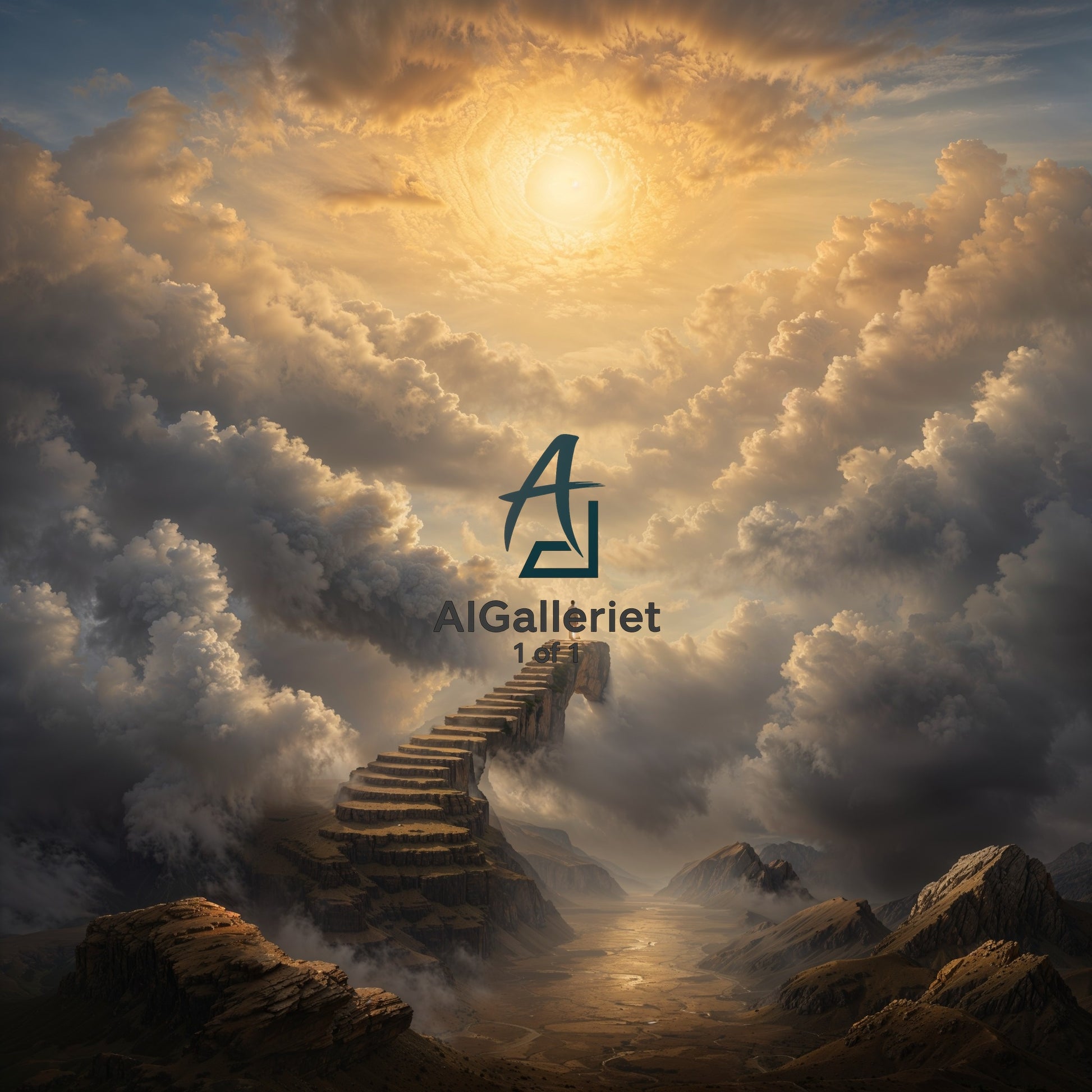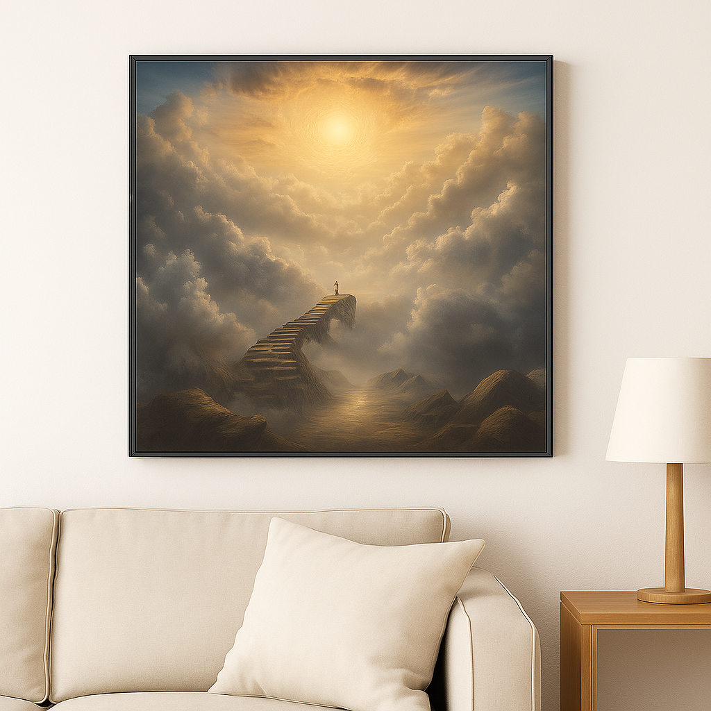 En enslig skikkelse klatrer opp en endeløs trapp som forsvinner inn i et lysende virvel i himmelen. Dette motivet vekker tanker om reise, drøm og oppvåkning. Skapt med kunstig intelligens – trykket i kun ett unikt eksemplar.