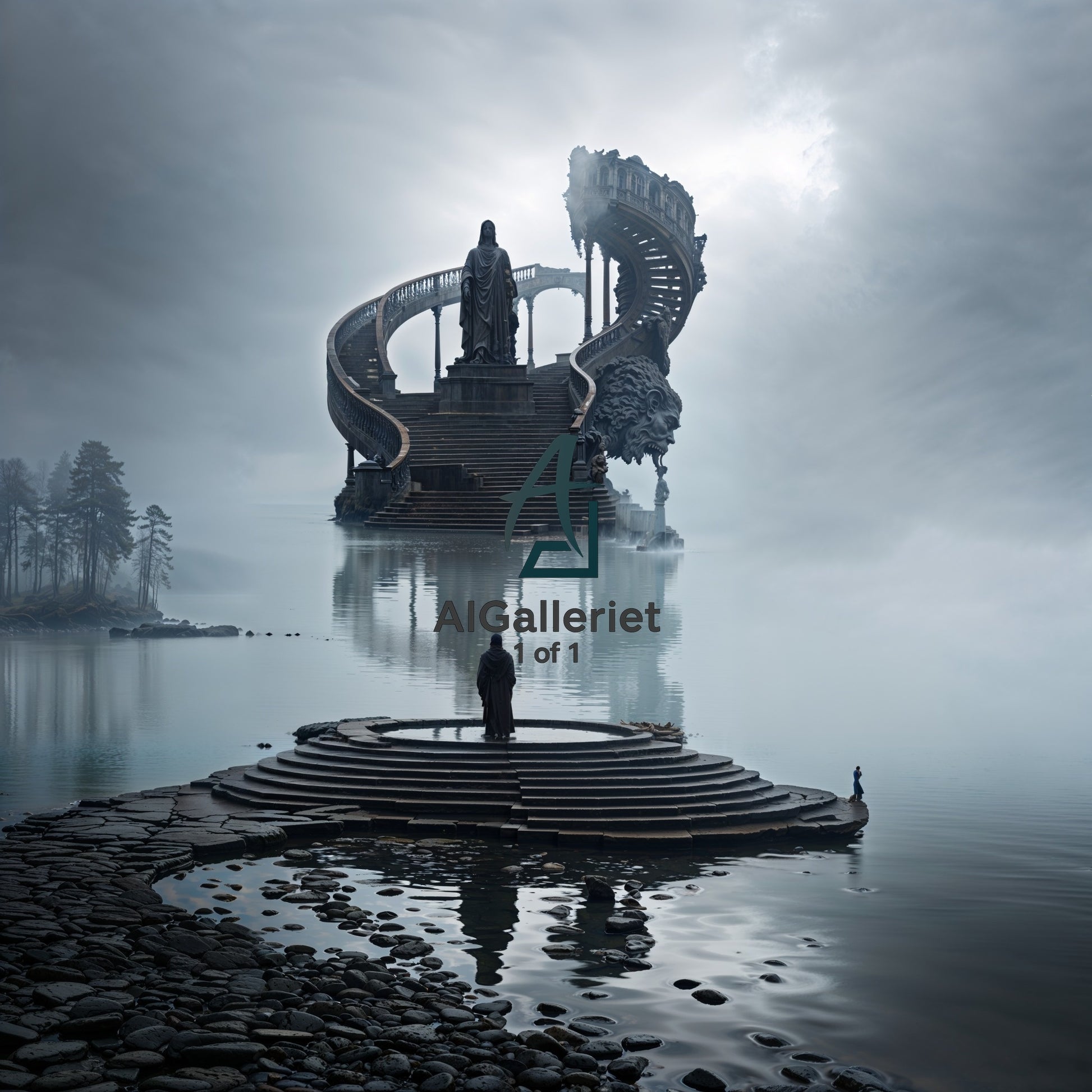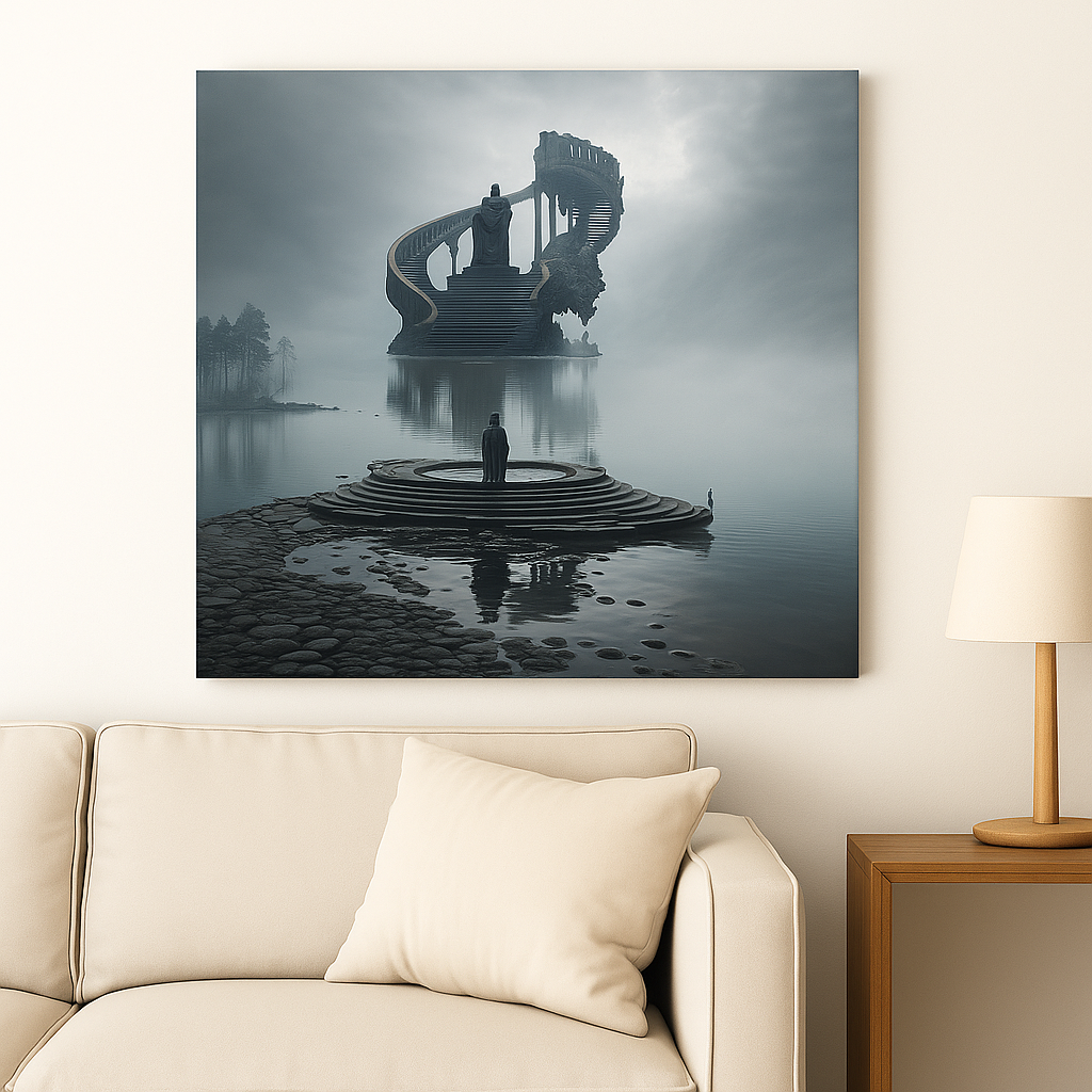 En ensom skikkelse står ved kanten av vannet, foran en spiraltrapp som reiser seg fra innsjøens tåke. Den leder opp mot skyene, men forsvinner før den når noe. På toppen står en statue — eller kanskje noe levende — og venter. Er dette begynnelsen, eller slutten?